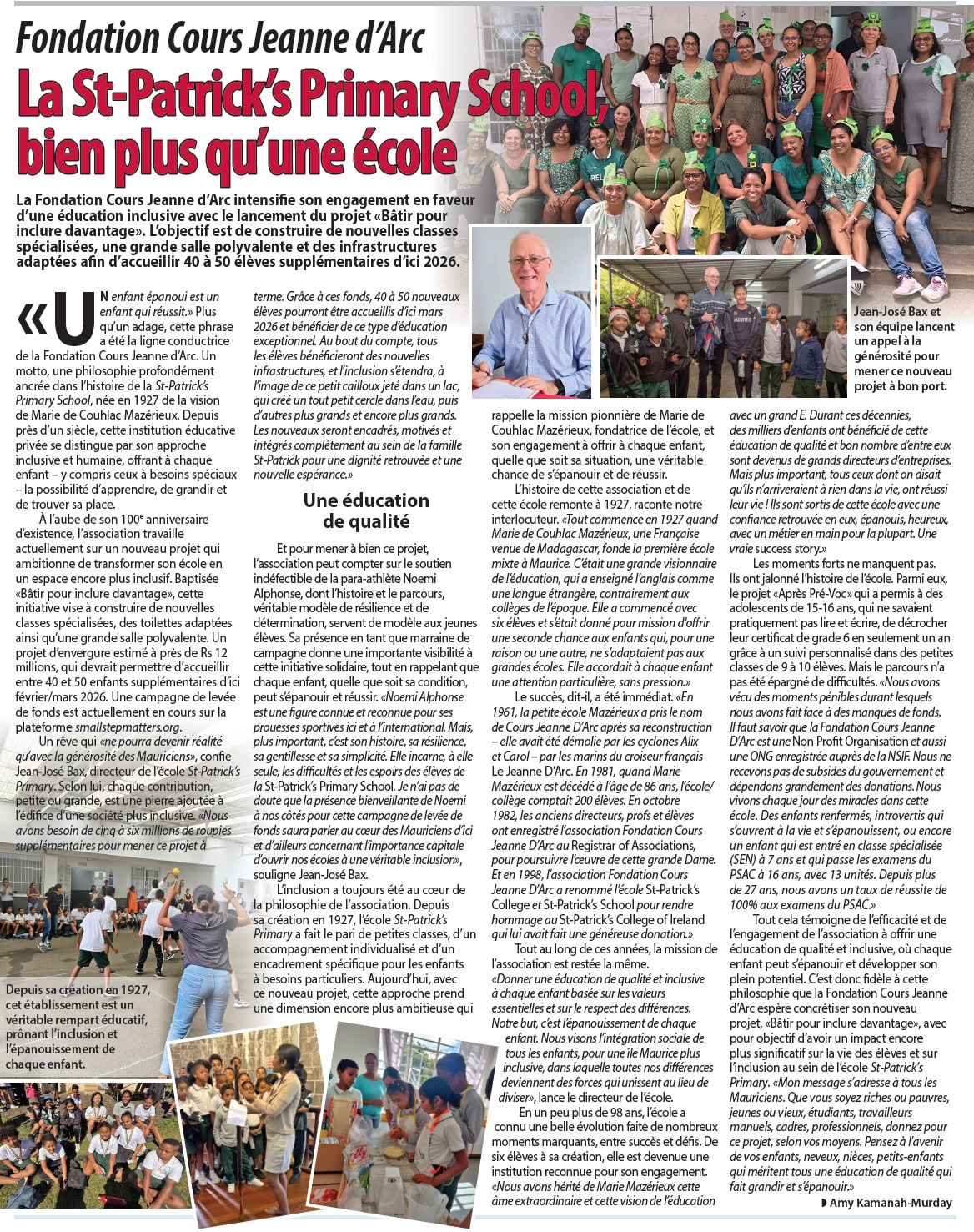 Fondation Cours Jeanne d’Arc – La St Patrick’s Primary School bien plus qu’une école.